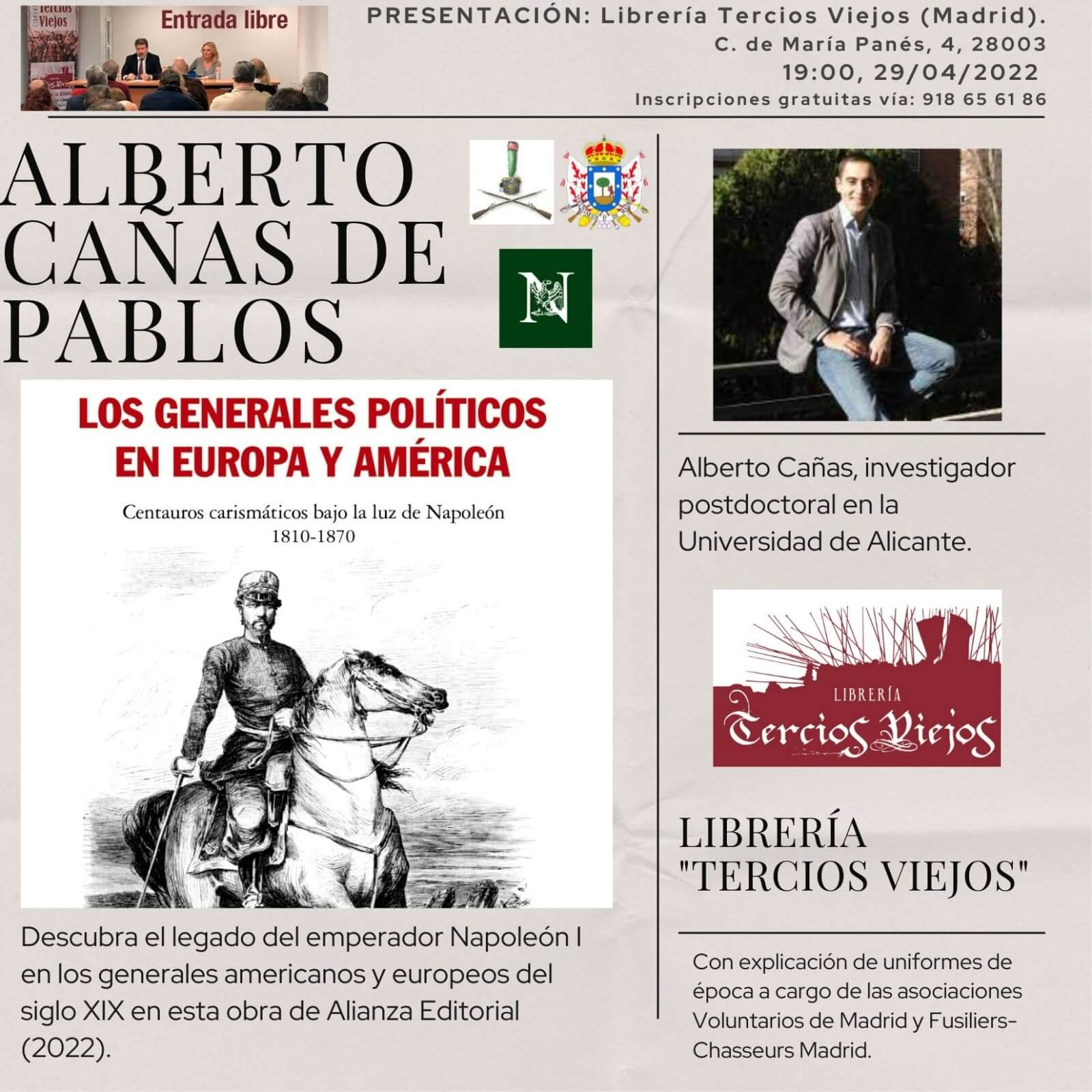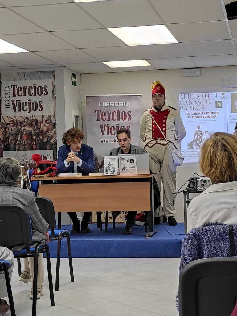 El pasado viernes Souvenir Napoléonien tuvo la amabilidad de patrocinar la presentación del nuevo trabajo del investigador de la Universidad de Alicante, Alberto Cañas de Pablos. Su obra “Los generales políticos en Europa y América (1810-1870): Centauros carismáticos bajo la luz de Napoleón” es un reflejo de las nuevas investigaciones alrededor de la Europa de Napoleón y nuestra asociación ha querido participar en su presentación. También nos acompañaron los «Voluntarios de Madrid». Os dejamos algunas fotografías.