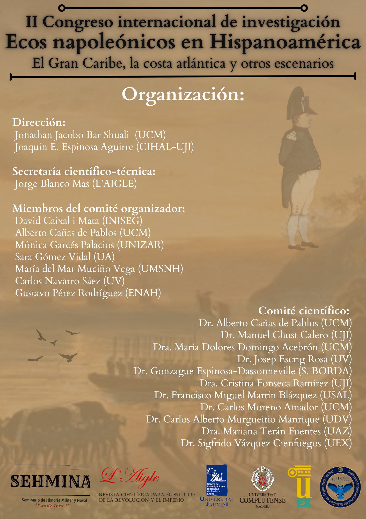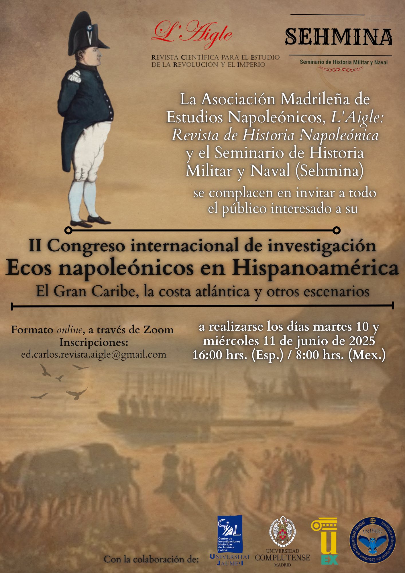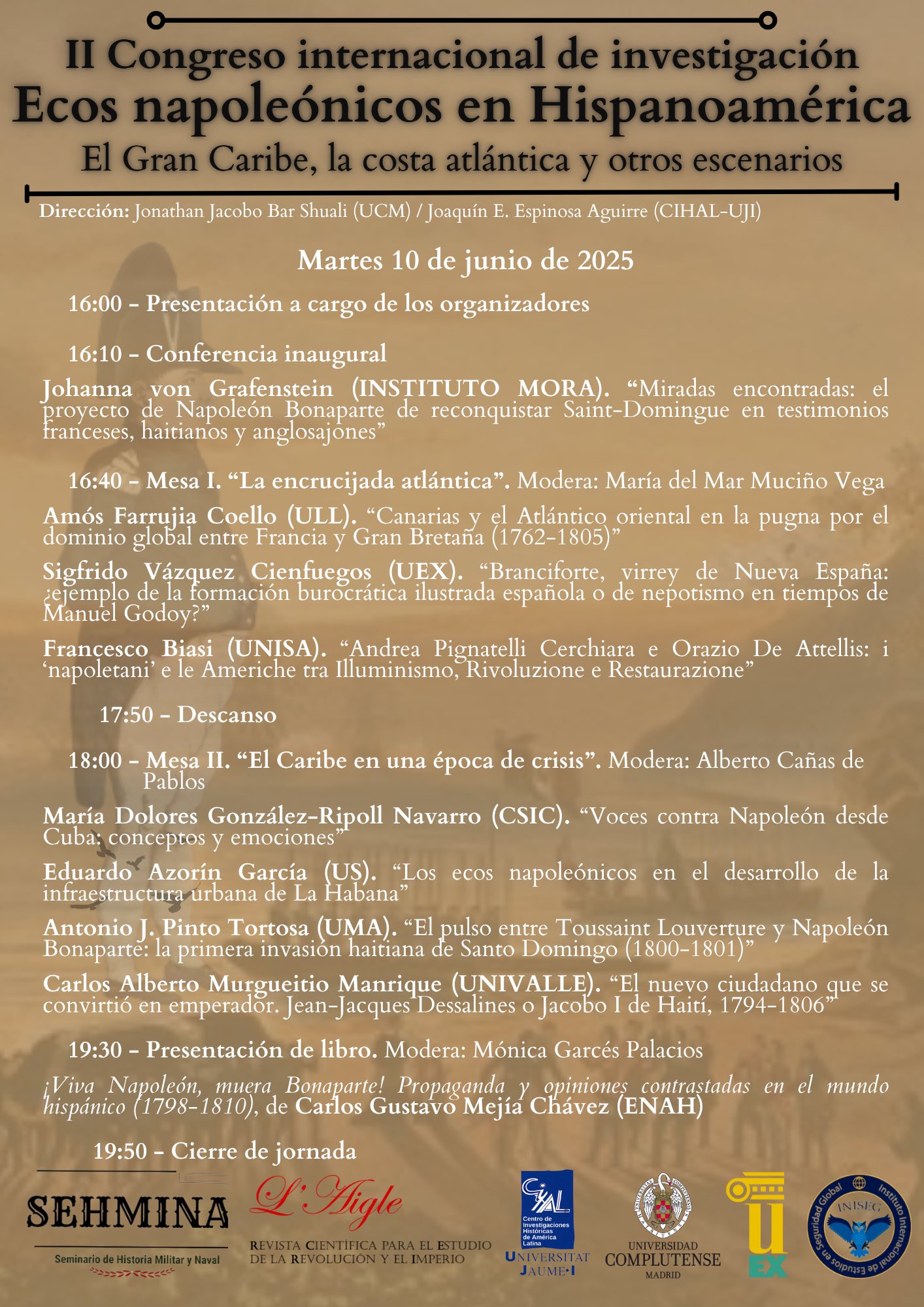 Compartimos el programa del II Congreso de Ecos Napoleónicos. Organizado en colaboración con el Seminario de Historia Militar y Naval (Sehmina), la Asociación Madrileña de Estudios Napoleónicos, la Universidad Complutense de Madrid, la Universidad de Extremadura y el Instituto Internacional de Estudios en Seguridad Global (INISEG)